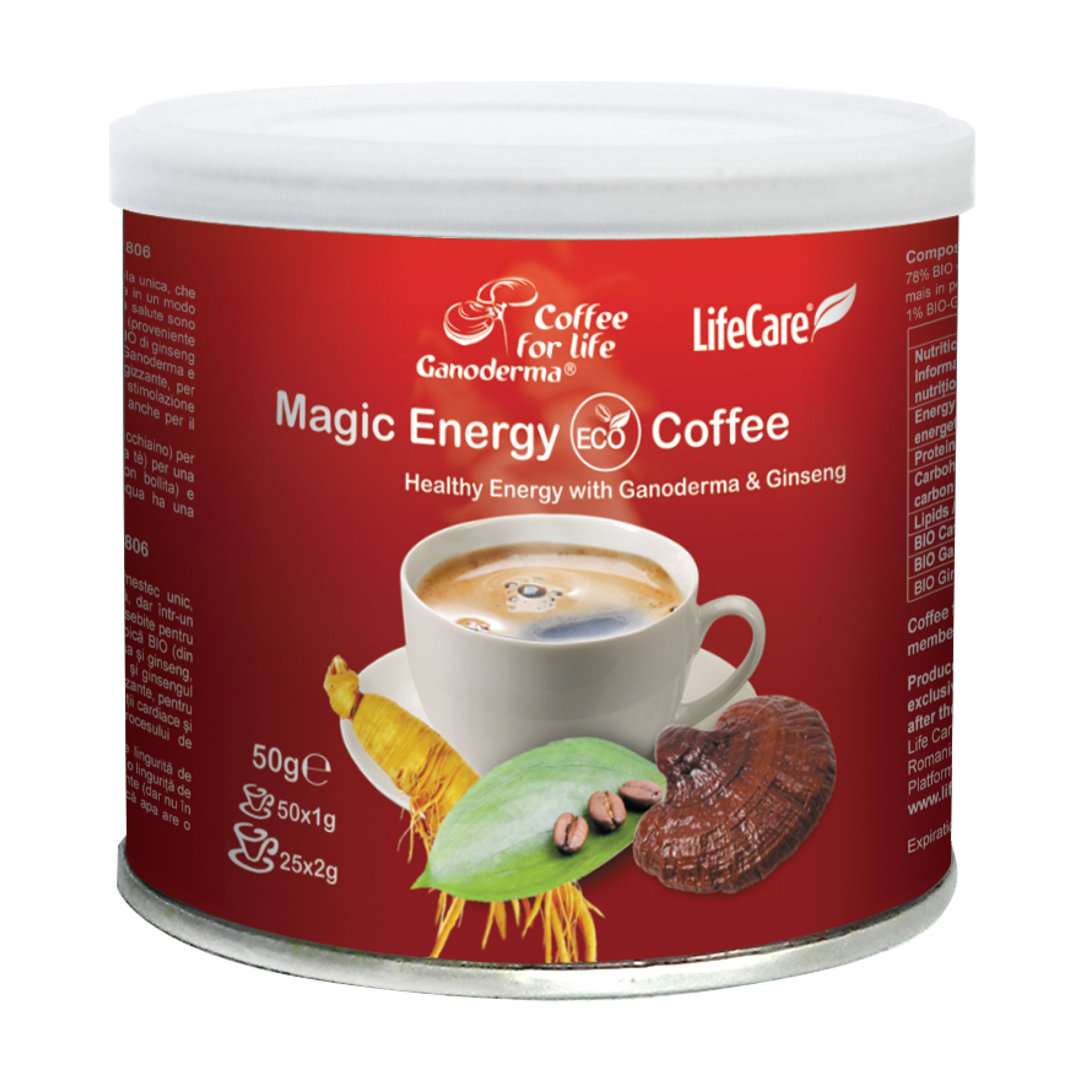 Magic Energy - Eco Coffee este cafeaua instant care îți oferă energie naturală și vitalitate, combinând cafea Arabica BIO, ganoderma și ginseng, toate certificate organic. Savurează o pauză sănătoasă și energizantă cu fiecare ceașcă!